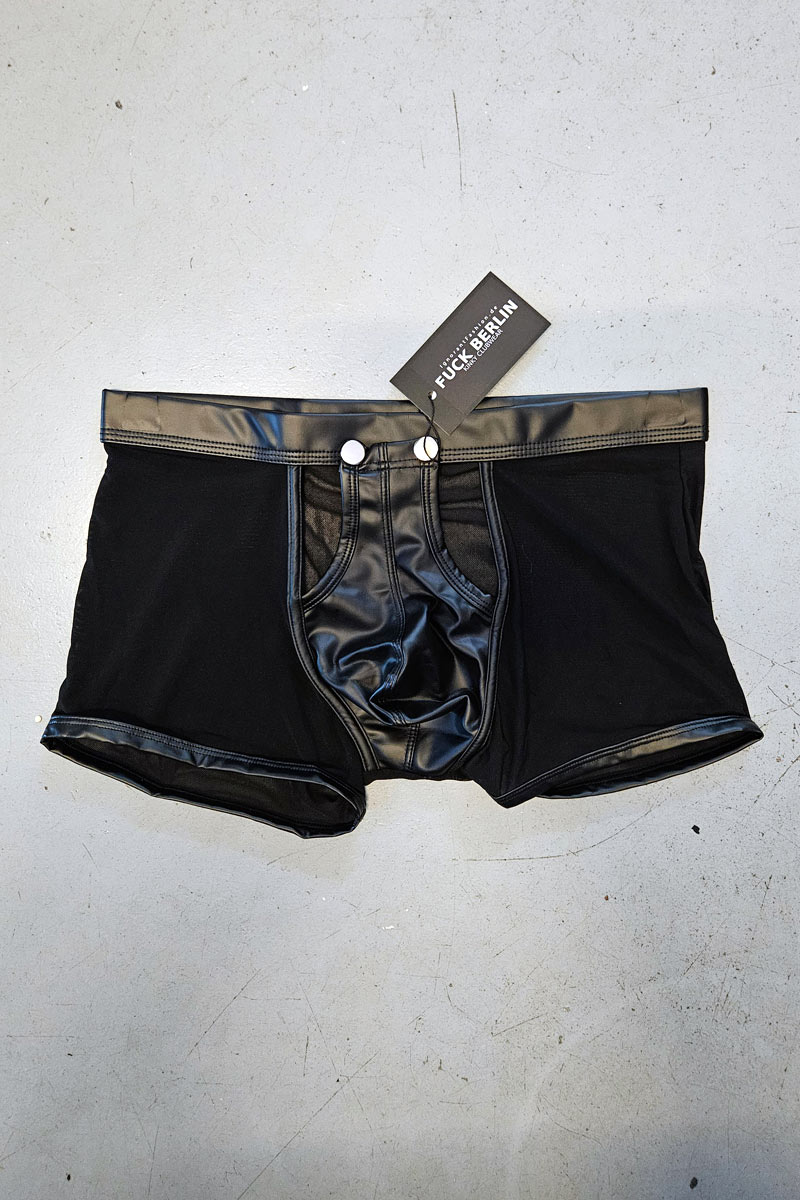 Die zwei Druckknöpfe am Bund geben einen utilitarian, industrial Touch, während die transparenten Mesh-Bereiche den provocativen Edge liefern. Boxer-Brief-Länge mit elastischem Bund garantiert comfortable Fit für Club, kinky Parties und Darkroom Nights.