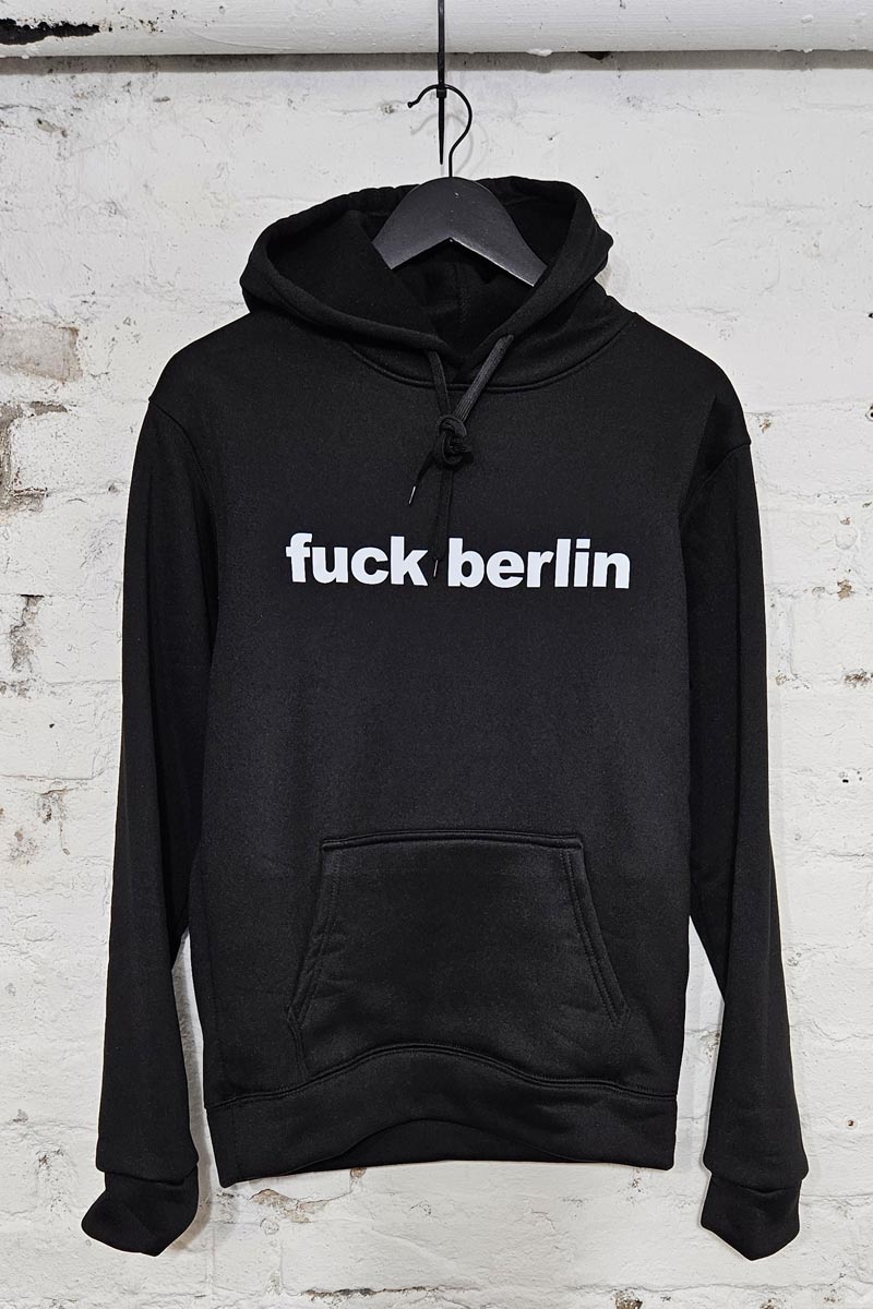 This black hoodie featuring "fuck_berlin" print on front and back is pure Berlin attitude. The minimalist white lettering on heavyweight polyester fleece captures the love-hate relationship with this city – direct, honest, unapologetic.