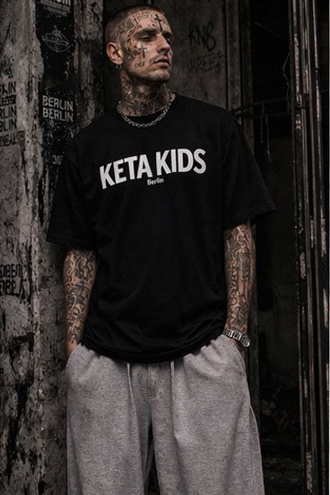 This black t-shirt featuring the iconic "KETA KIDS" print in white is the ultimate statement piece of Berlin's underground scene. The large, bold lettering makes it clear which crew you belong to – no questions, no explanations.